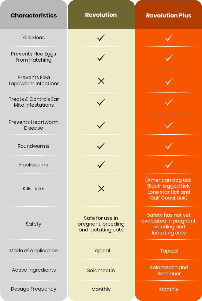 - Tick coverage: Revolution Plus offers protection from four tick species, i.e., American dog tick, Black-legged tick, Lone star tick and Gulf Coast tick, whereas Revolution does not protect cats against ticks.